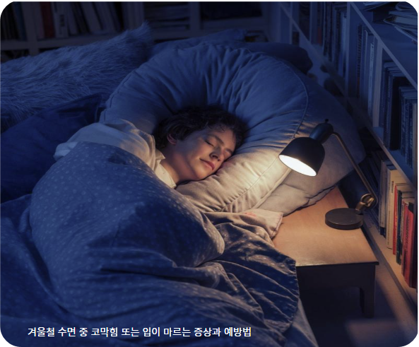 겨울철 수면 중 코막힘과 입 마름 증상은 많은 사람들이 경험하는 흔한 문제입니다.  특히 차가운 날씨와 실내 난방으로 인해 공기가 건조해지면서 이러한 증상이 악화되기 마련입니다.