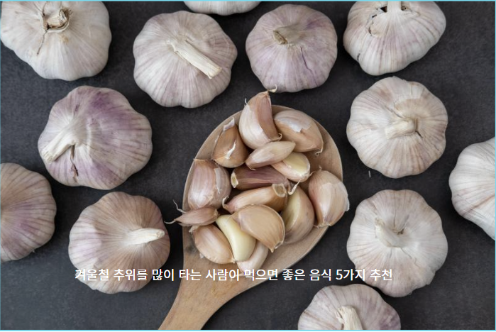 마늘은 면역력을 강화하고 혈액 순환을 원활하게 해주는 식품입니다.  마늘에 들어 있는 알리신 성분은 항균 효과가 뛰어나 감기 예방에도 효과적입니다.