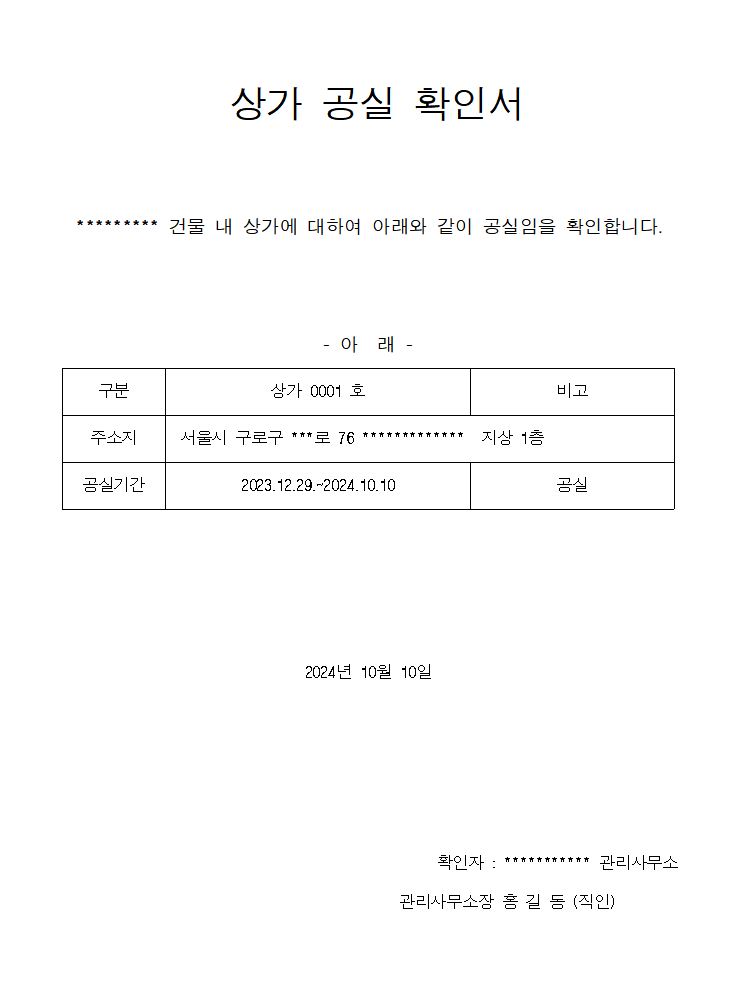 공실 기간의 확인 공실 기간 증명 확인서
