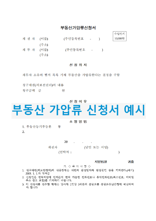 법원의 표시는 가압류신청 관할법원을 기재하며 소명방법의 표시는 채무자의 소유를 증명할 수 있는 부동산등기부등본 및 청구채권에 대한 증빙서류를 기재하면 된다. 그리고 기타 년월일의 표시, 당사자 또는 대리인의 기명날인 또는 서명을 하고 별지에 가압류할 부동산 내용을 기재하여야 한다.