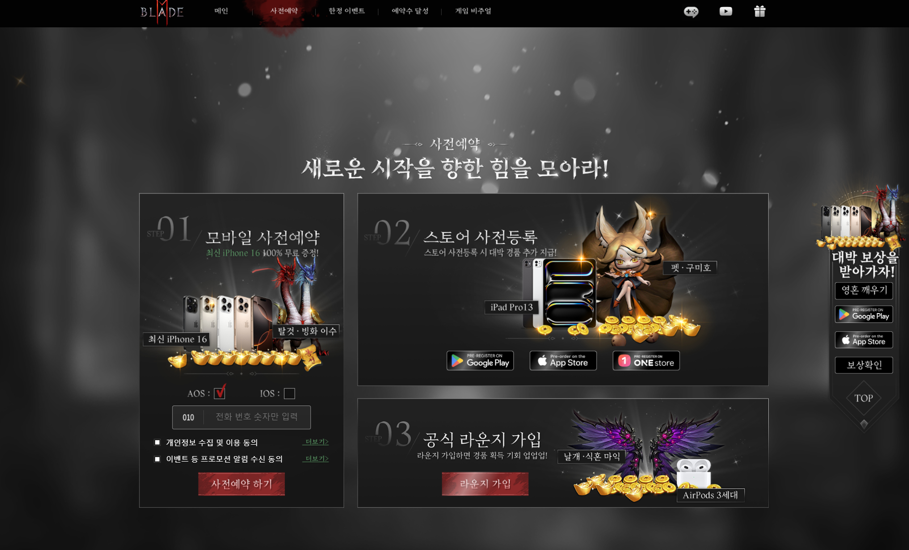 오늘부터 사전 예약을 시작하는 블레이드 M 게임의 사전예약도 하고 이벤트 참여도 하여 게임 내 사용할 수 있는 아이템과 아이폰, 아이패드, 에어팟, 갤럭시s24 울트라 상품을 추첨을 통해 행운의 주인공이 될 수 있는 기회를 가져 보세요.
