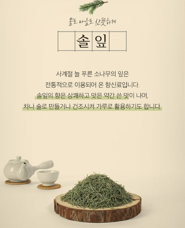 솔잎 특유의 아로마 향이 신경을 안정시키고 스트레스를 줄이는 데 도움을 줍니다. 또한 피로 회복에도 좋은 효과가 있습니다.