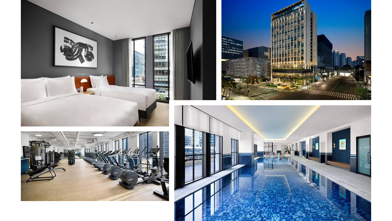 - 호텔 최상층에 위치한 수영장은 넓은 실내 공간과 양면이 통창으로 되어 있어 성남 서울 공항과 판교테크노밸리를 한눈에 볼 수 있으며 성인풀과 가족 고객을 위한 패밀리풀, 키즈풀, 플레이풀의 구성과 함께 365일 따듯한 물로 채워지는 자쿠지까지 갖추고 있습니다.