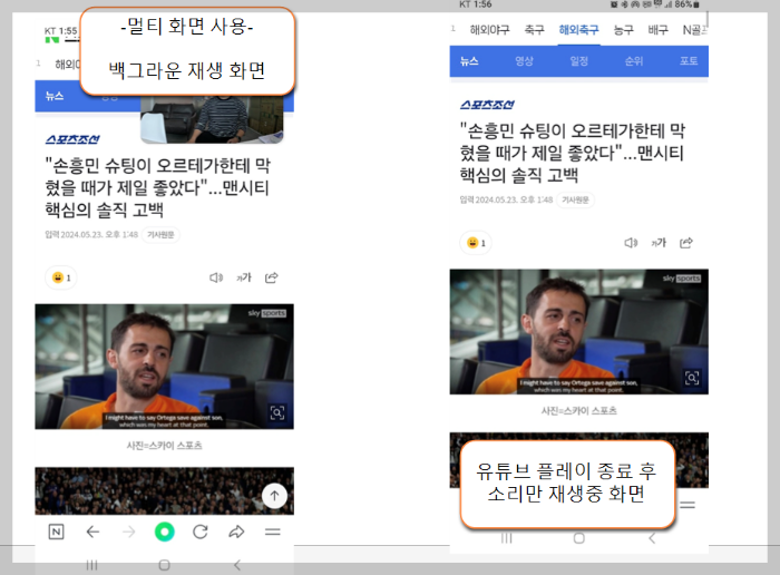 백그라운드 재생은 멀티 스크린 화면으로 전환되어 유튜브 영상과 스마트폰 다른 앱을 동시에 사용할 수 있다.