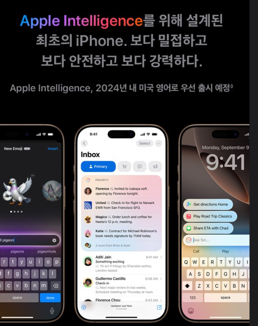 아이폰16 시리즈 전 제품에 적용된 칩셋은 A18으로 프로맥스의 경우 6 코어 GPU가 탑재되어 있어서 애플에서 개발하여 적용될 예정인 AI 기능인 애플 인텔리전스가 10월부터 영어로 우선 출시 예정이라고 합니다.