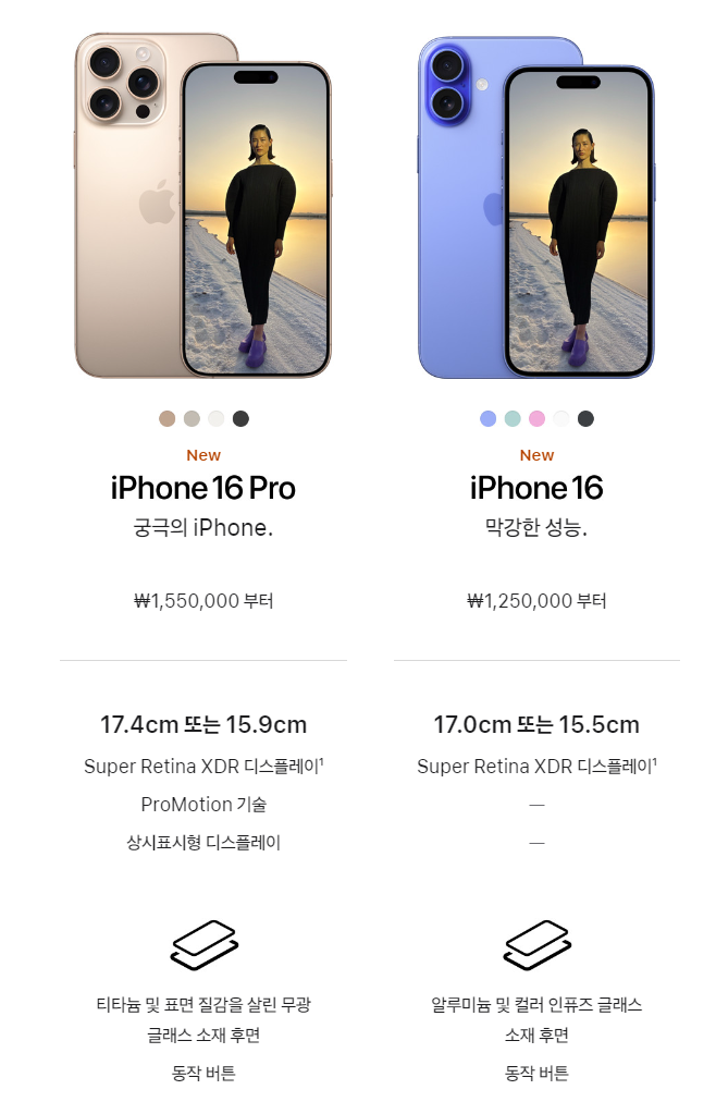 그 외에 상세한 아이폰16 스펙이 궁금하시다면 애플 스토어 사이트에서 확인하실 수 있습니다.