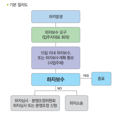 만일 사업주체가 하자보수를 하지 않거나 이견 및 분쟁이 발생하면 국토교통부 산하의 공동주택 하자심사분쟁조정위원회에 소유자인 입주자가 하자심사 또는 분쟁조정을 신청하거나 법원에 하자소송을 제기하는 방법이 있다. 아래의 표는 하자 처리 기본 절차 순서이다.