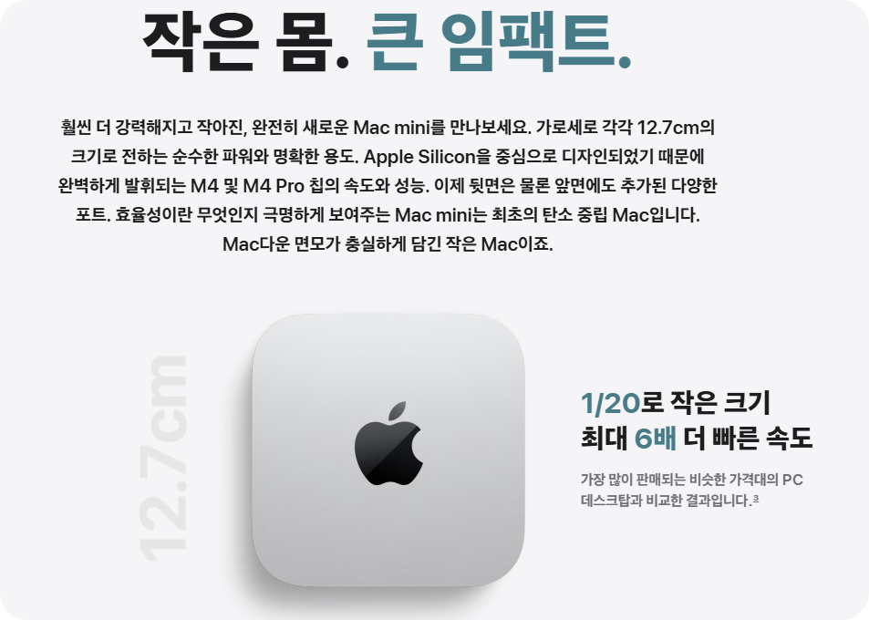 디자인적으로도 M4 맥미니는 주목할 만한 변화가 있었습니다.  크기는 이전 모델보다 절반 이상 줄었고, 12.7cm의 정사각형 형태로 손쉽게 이동할 수 있는 포터블 특징을 갖고 있습니다.