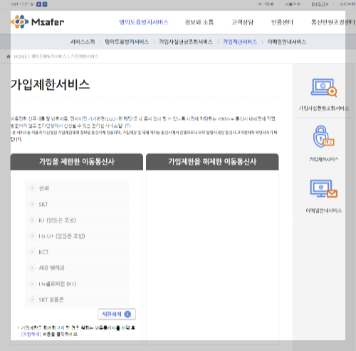 저는 일단 전체 통신사 가입제한을 신청하였습니다. 나중에 신규개통이나 번호이동 전에 엠세이퍼 사이트에서 제한해제를 하면 됩니다. 혹시나 제한해제가 오류발생 시 해당 통신사 고객센터를 통해 확인하시면 된다고 합니다.
