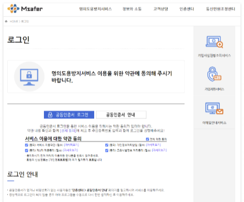 스마트폰 등 가입사실을 엠세이퍼 가입사실현황조회서비스를 이용 방법은 회원가입을 하는 것이 아니라 공동인증서가 있어야 가능합니다.