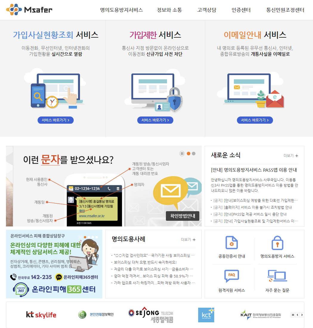 엠세이퍼란 스마트폰, 인터넷, 유선전화, 인터넷전화, 유료방송 등 통신서비스의 가입이나 명의변경 등의 사실을 본인에게 이메일 또는 sms로 통보해 주는 서비스를 말합니다.