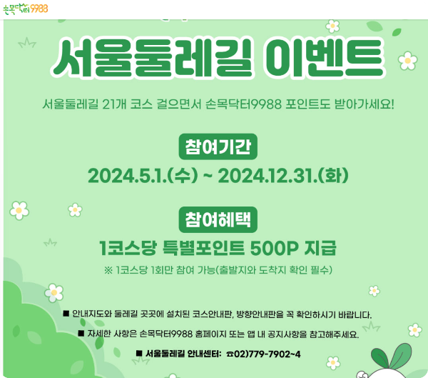 손목닥터9988은 서울 둘레길 21개 코스로 서울의 역사, 문화, 자연생태 등을 스토리로 조성한 도보길을 직접 체험도 하고 손목닥터 포인트도 얻을 수 있는 이벤트를 진행하고 있습니다.