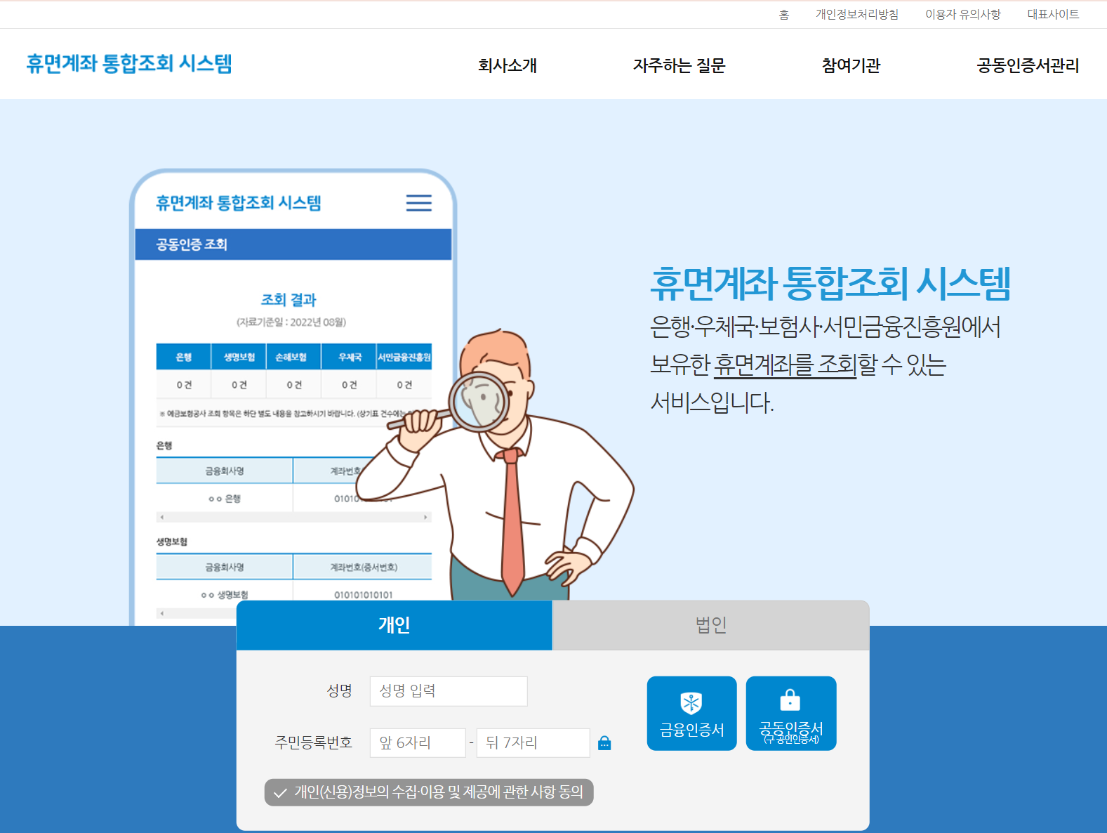 휴면계좌 통합조회 시스템을 이용하면 은행, 우체국, 보험사, 서민금융진흥원에서 보유한 휴면계좌를 한 번에 조회할 수 있는 서비스를 제공합니다.