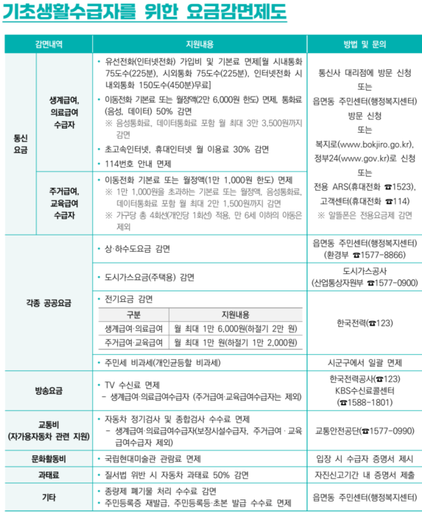 아래는 기초생활수급자를 위한 요금감면제도의 자세한 내용 및 감면 신청 방법 및 문의 연락처 홍보자료를 참고해 주세요.