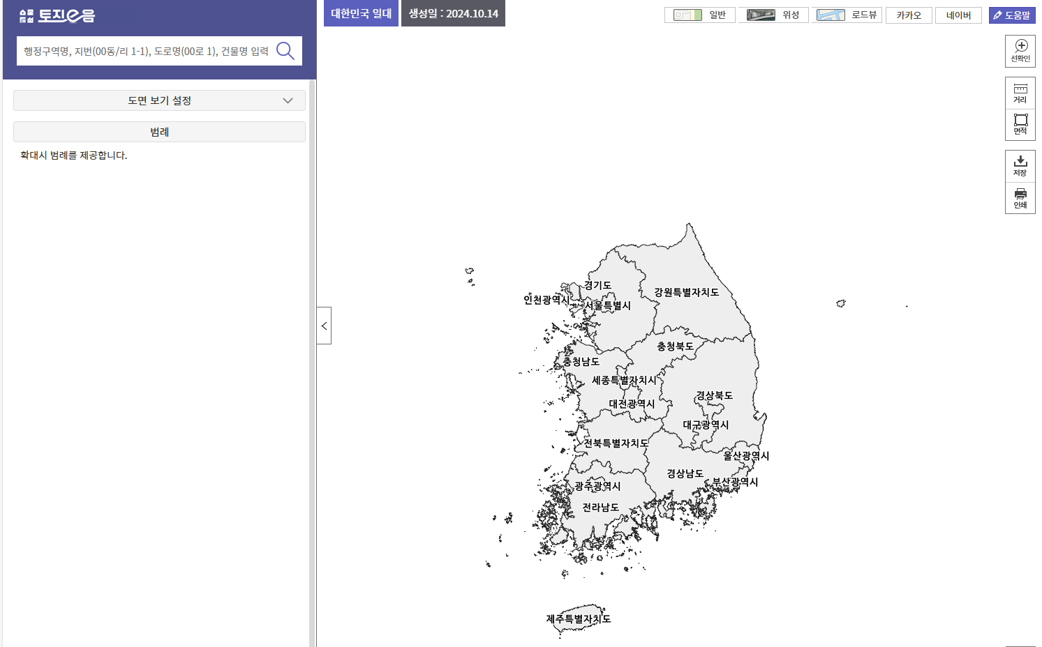 정보 열람 클릭한 지역의 정보는 화면 오른쪽에 나타납니다. 여기서는 해당 토지의 지적도, 용도지역, 건축물 대장 정보 등을 확인할 수 있습니다.