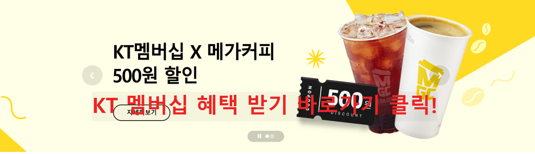 위 스타벅스 무료 이외에도 메가커피에서는 VIP 기준으로 한 달에 2잔 아메리카노를 간단히 KT 멤버십 혜택을 통해 아메리카노를 무료로 즐길 수 있습니다.
