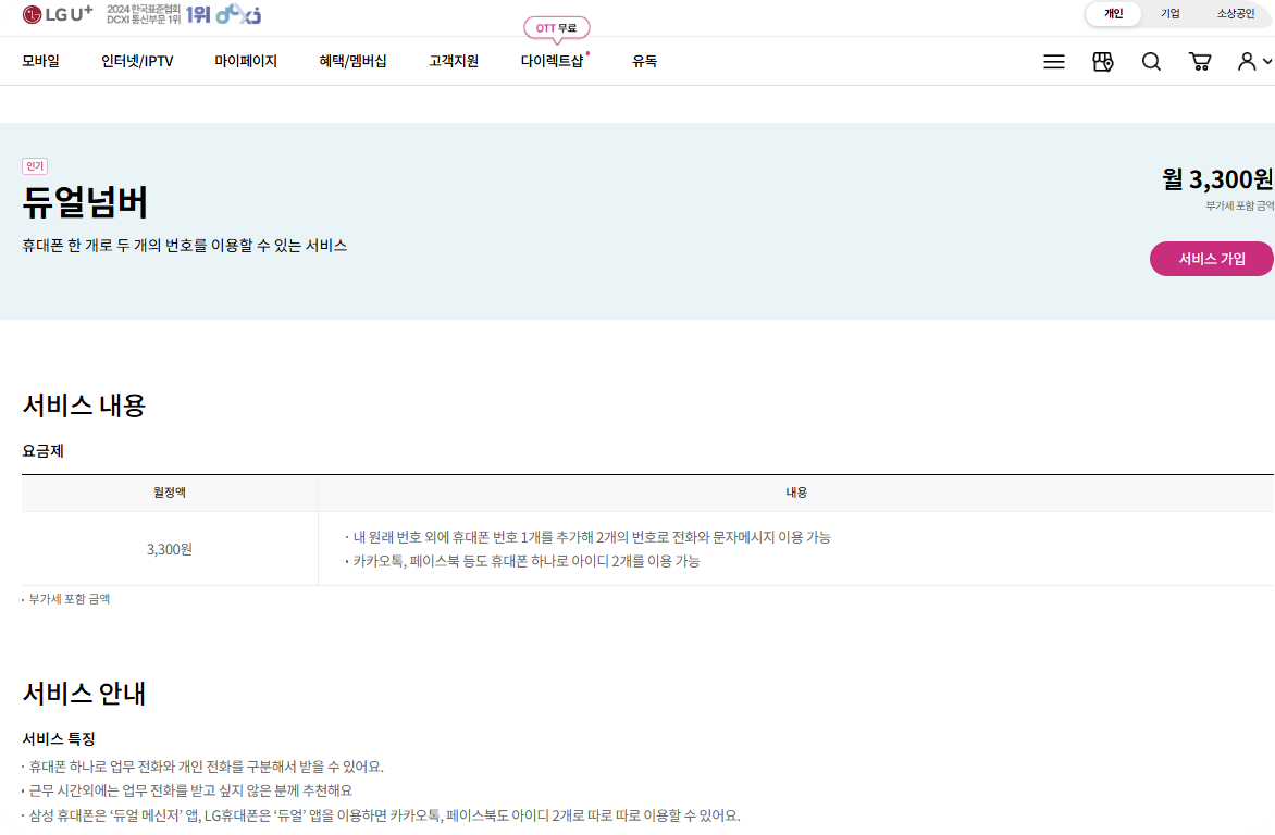 듀얼 넘버 서비스는 월 3,300원의 요금으로 제공되며, 장기 고객의 경우 연말까지 무료 혜택을 받을 수 있습니다.