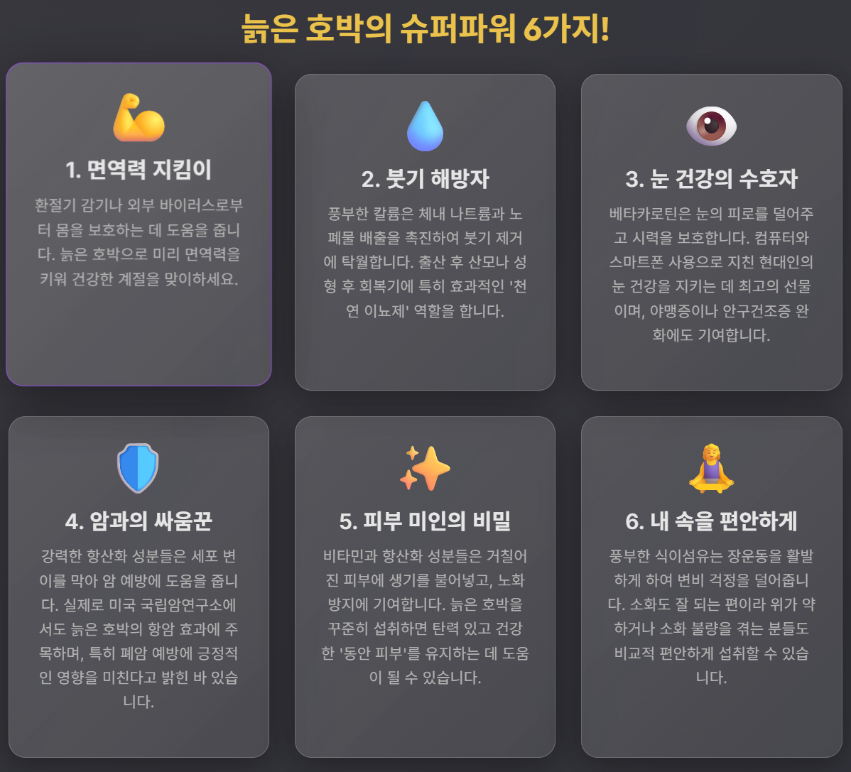 늙은 호박의 상징인 선명한 노란색은 강력한 항산화 성분인 '베타카로틴' 때문입니다. 이 베타카로틴은 체내에서 비타민 A로 전환되어 우리 몸을 유해산소로부터 보호하고, 세포 손상을 막아 노화를 지연시키는 슈퍼 히어로와 같은 역할을 합니다.